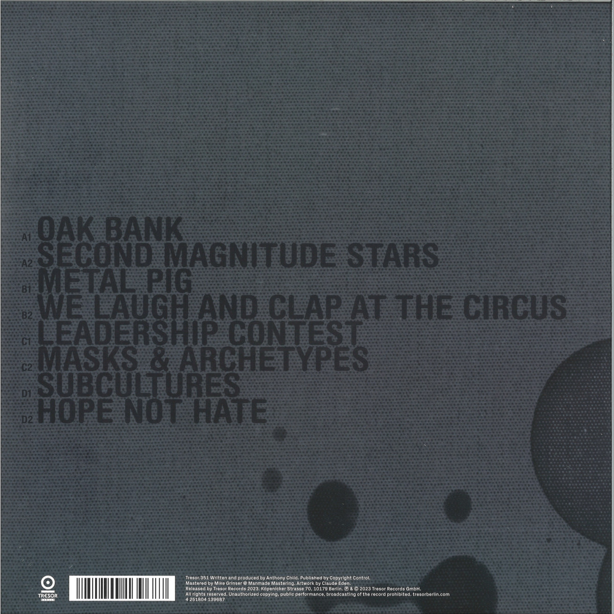 The result is eight tracks that emphasise a new techno sound for Surgeon, drawing in references from across the musical spectrum. "I can hear Coil, King Tubby, Detroit Techno and The Cure all wrapped up with 30 years of DJing," Surgeon says of the album. Melancholic hum-like ambiences smudge around unadorned, near-droning basslines, crunching rhythm and percolating arpeggiations. The tracks carry unique and potent locomotion, with a low-slung grind through toughened terrains, breathing with a free spirit, untethered by a studio-based perspective. We hear manifestations of the same raw material across the album, like a textural motif, carving new variants and creating a cohesive work full of recollection.